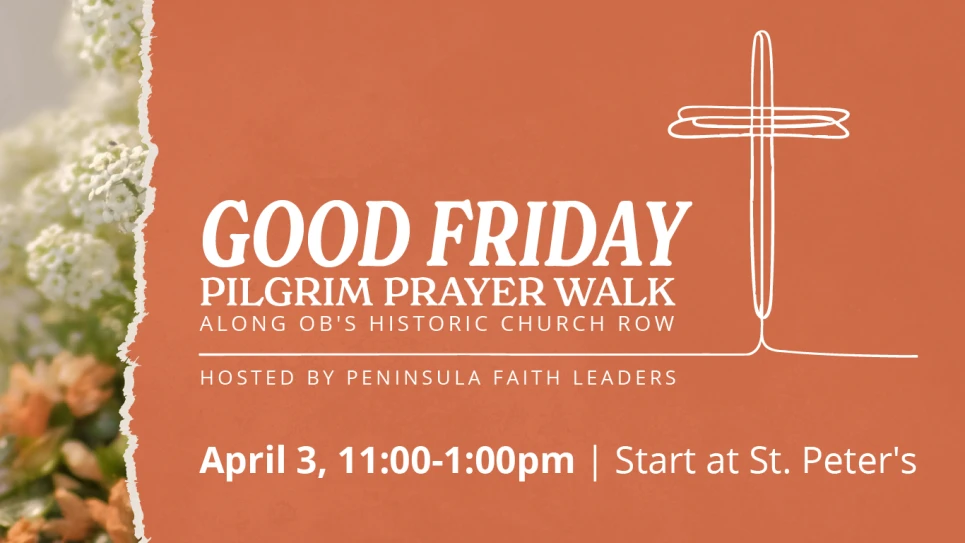 We are partnering with fellow Peninsula Faith Leaders for a pilgrimage through Ocean Beach’s historic Church Row, with stops at local churches and ministry locations that reflect on the theme "Jesus died for..." The 1-mile walk is mostly flat, and begins at St. Peter's Lutheran Church. Return transportation will be provided from the end.