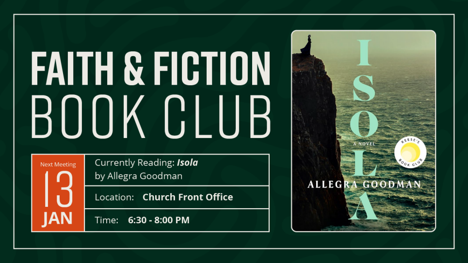 In this book club we dive into fiction and explore connections to our faith. Whether you're a seasoned bookworm or a casual reader curious about exploring faith through the lens of fiction, everyone 18 and older is welcome! This month’s book: Isola by Allegra Goodman.