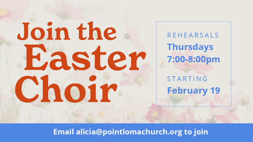 Experience the joy and celebration of worship by singing with other adults for our Easter services. Rehearsals are on Thursdays, 7:00-8:00pm, starting February 19. Email to join.