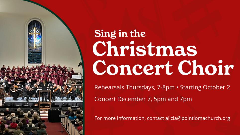 Join the Christmas Concert Choir to sing in our annual Christmas Concert with a chamber orchestra on December 7 at 5pm and 7pm. Rehearsals are on Thursdays, 7-8pm, starting October 2. Choir retreat Saturday, October 25, 9am-12pm. Email to join!