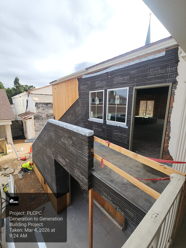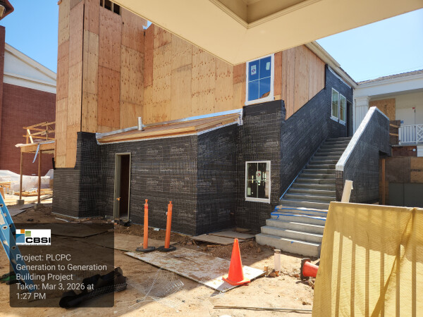 Work is also progressing on the building’s exterior. The walls are currently being prepared for stucco, which is already visible around the newly constructed exterior staircase. Located next to the elevator on the first floor, outside of the preschool playground, this staircase will provide direct access to the Kids’ Worship spaces upstairs.